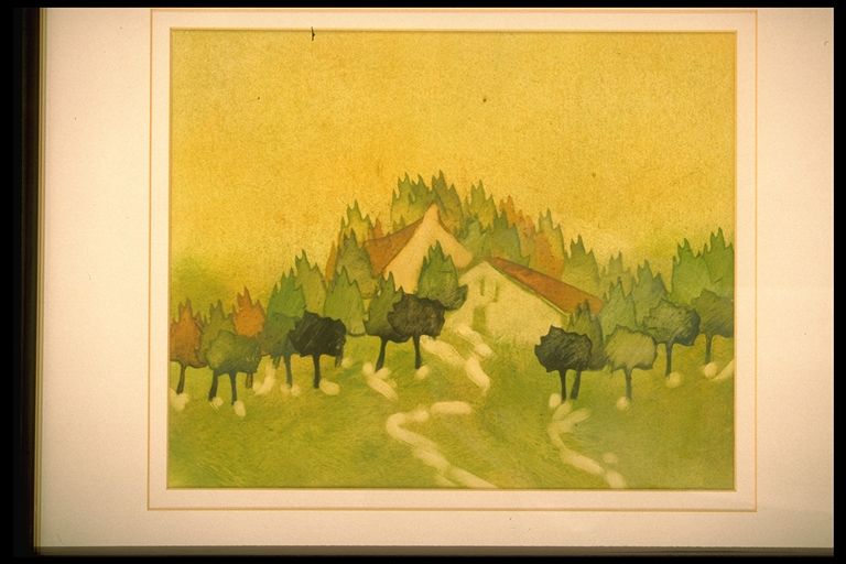 | Resumen: | Técnica: Aerógrafo Materia-soporte: Papel Dos casas de campo entre árboles. |