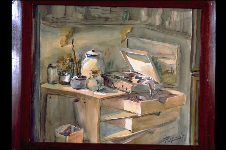 | Deskribapena: | Exposición Técnica: Acuarela Materia-soporte: Papel Fecha de ejecución: 1986 Naturaleza muerta, rincón del estudio de un artista. Firmado y fechado en ángulo inferior izquierdo. |
