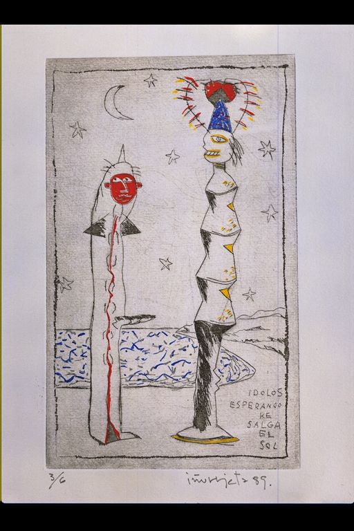 | Deskribapena: | Técnica: Grabado Materia-soporte: Papel Dos personajes en forma de espantapájaros. Firmado y numerado en ángulos inferiores. |