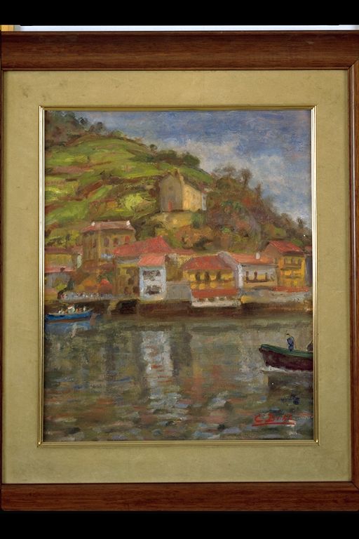 | Deskribapena: | Exposición Técnica: Óleo Materia-soporte: Lienzo Embarcadero con edificios y monte a su fondo. Firmado en ángulo inferior derecho. |