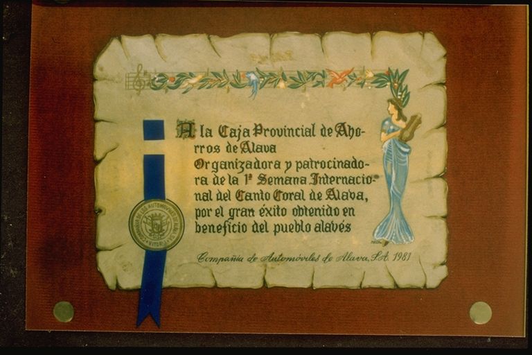 | Título: | A la Caja Provincial de Ahorros de Álava organizadora y patrocinadora de la 1ª Semana Internacinal de Canto Coral de Álava... |