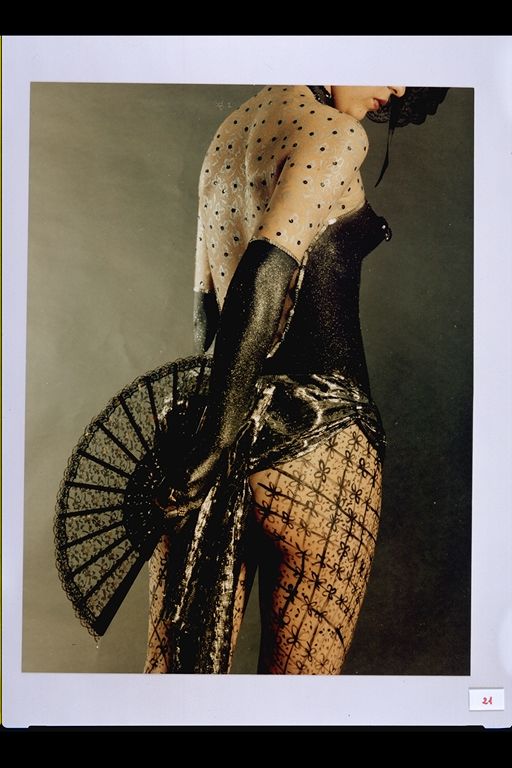 | Description: | Certamen Técnica: Fotografía color Materia-soporte: Papel Modelo de traje de noche con abanico. |