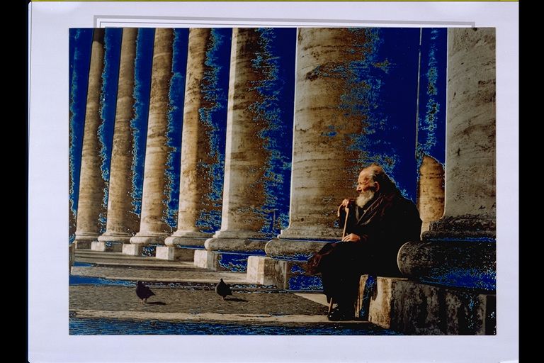 La fotografía destaca la presencia de un anciano sentado en primer término al pie de unas columnas que sirven de fondo, equilibran la composición dos palomas igualmente situadas en primer término. La monumentalidad de las columnas enmarcan la figura del personaje que mira al horizonte queriendo recuperar el pasado.