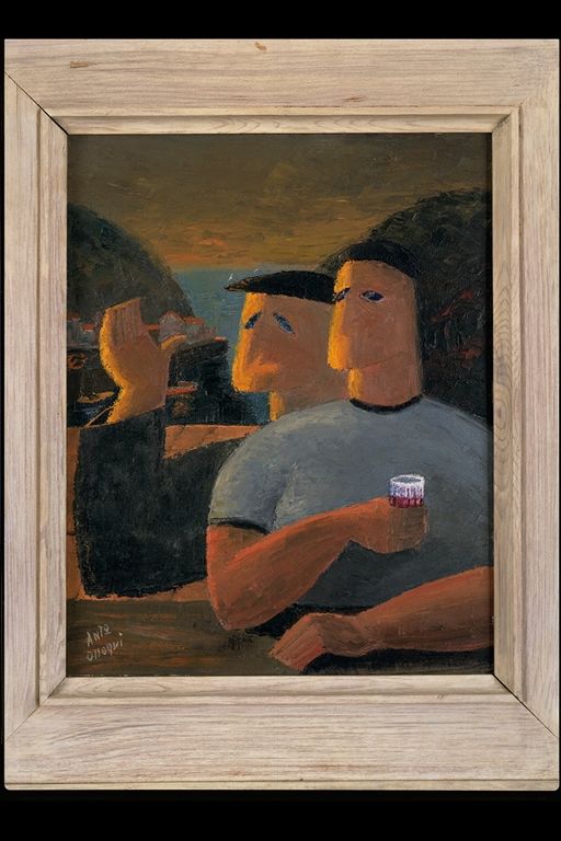 Dos vascos conversando con un vaso de vino en la mano. Al fondo el puerto.