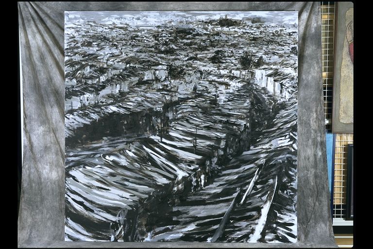 | Deskribapena: | Certamen Arte Plástico Contemporáneo Técnica: Acrílico Materia-soporte: Tela Fecha de ejecución: 1996 Esta pintura realizada con técnica expresionista representa un paisaje en panorámica realizado con tonos monocromos que en el primer término destaca por su contraste, consiguiendo una clave cromática que se describe como dramática. Es por ello que la técnica y el color aportan gran expresividad a este paisaje, muy logrado, por otra parte, en la sensación de profundidad. La obra resulta plásticamente muy impactante. |