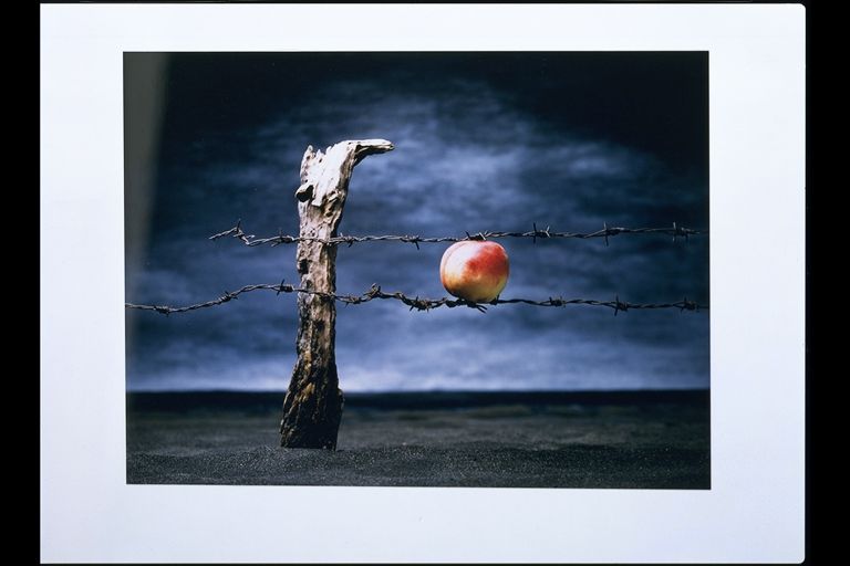 | Deskribapena: | Certamen Fotográfico Internacional. 1996. Premio de honor. Técnica: fotografía color Materia-soporte: papel fotográfico Fecha de ejecución: 1996 En el primer término de la foto destaca una alambrada cuyos alambres de espino atrapan a una manzana. Al fondo, un paisaje de soledad. La foto surrealista parece querer establecer un paralelismo analógico del mundo atrapado en la soledad. |