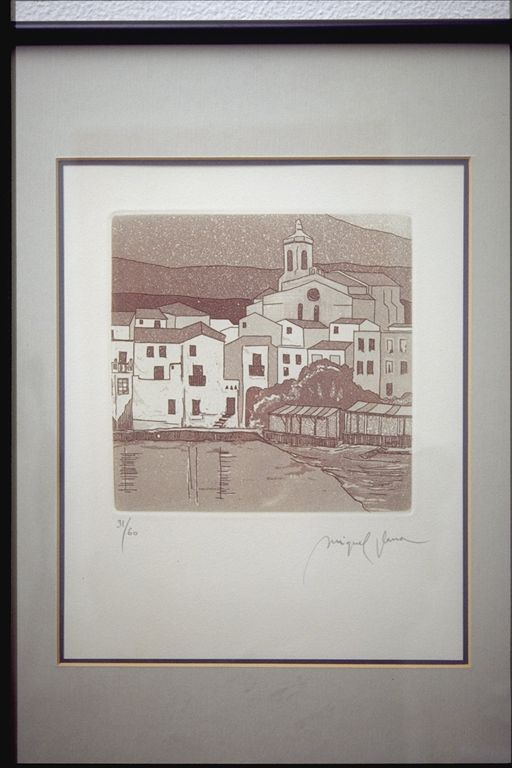 | Deskribapena: | Técnica: Grabado Materia-soporte: Papel Paisaje de playa con casetas en primer término, casas e iglesia del pueblo, al fondo montañas. Numerado y firmado en ángulos inferiores. |