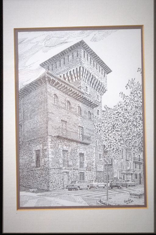 | Deskribapena: | Técnica: Plumilla Materia-soporte: Papel Fecha de ejecución: 13/09/1960 Vista de la torre, casa de cuatro plantas con gran alerón de madera. Firmado y fechado en ángulo inferior derecho. |