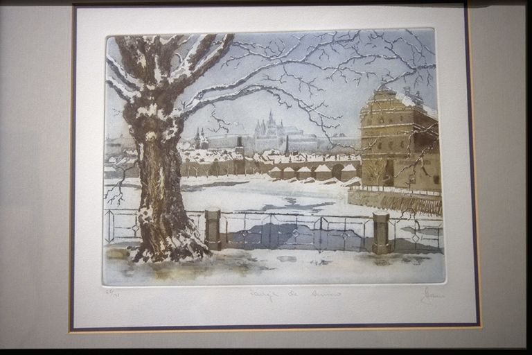 Paisaje nevado con río helado, puente y ciudad al fondo. En primer término gran árbol seco.