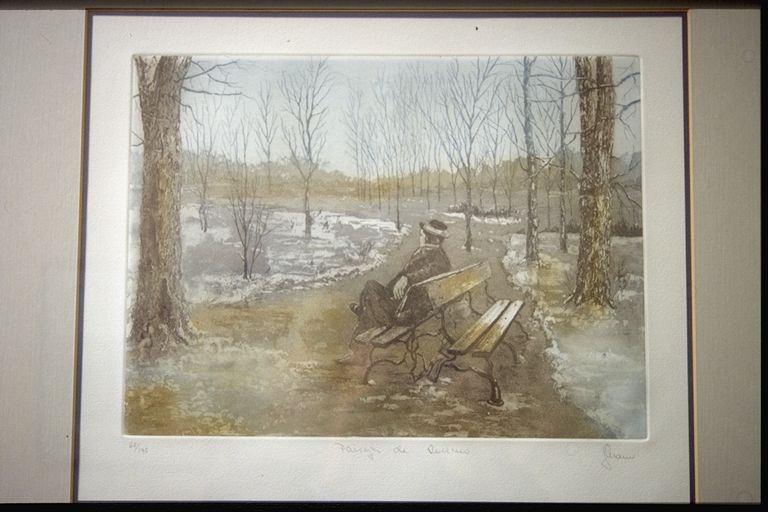 | Deskribapena: | Técnica: Grabado Materia-soporte: Papel Paisaje con espectador sentado y árboles sin hojas. Numerado y firmado en ángulos inferiores. |