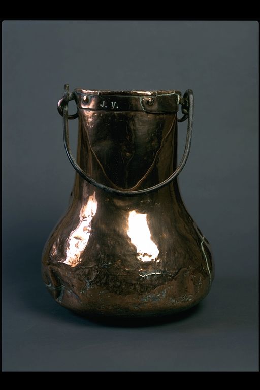 | Resumen: | Técnica: Estampación-Forja Materia-soporte: Cobre-Hierro Caldera de cobre en forma de pera con asa de hierro forjado e iniciales grabadas en el contrafuerte superior J.V. Expurgado Nota: la pieza ya no pertenece al Patrimonio de la Fundación Vital. |