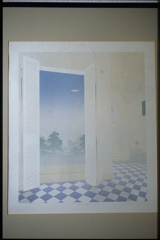 | Deskribapena: | Técnica: Litografía Materia-soporte: Papel Estancia enlosada en azulejos blancos y azules con ventana abierta a un jardín con cielo azul. Inscripción en la parte inferior. |