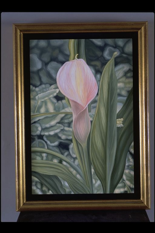 | Deskribapena: | Exposición La flor de una planta, concretamente una cala de color rosado. Firmado en ángulo inferior izquierdo. |