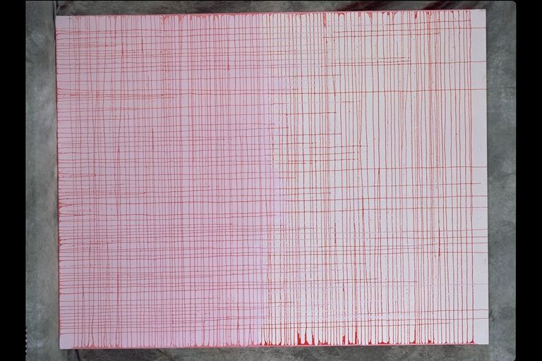 Sobre un fondo blanco de tela virgen. El artista ha trazado líneas rojas en forma de cuadrícula. La composición minimalista se halla repleta de sugerencias con las que el espectador podrá especular. Desde un punto de vista puramente compositivo se entiende que el autor ha construido un entramado lineal de sugerencias ópticas y connotaciones como el diseño y las fórmulas preconizadas por los artistas que integraron la Bauhaus.