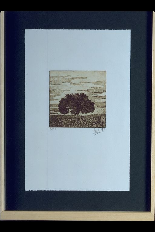 Árbol en el centro y casa a la derecha de la composición.