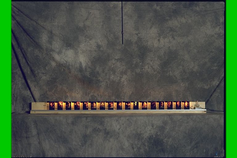 | Resumen: | Certamen Técnica: Instalación mixta Materia-soporte: Celuloide-Madera-Cristal Representación de fotogramas sobre un soporte con luz. |
