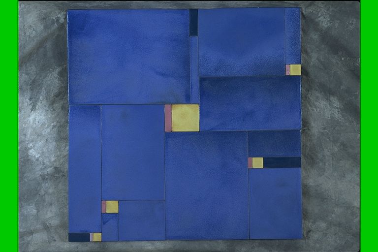 Alicatado de cerámica morada en varios tamaños con incrustaciones con otros amarillos y naranjas.