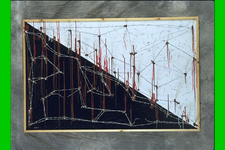 | Deskribapena: | Certamen Técnica: Mixta Materia-soporte: Madera-Hierro Panel en blanco y negro sobre el que se instalan clavos antiguos de forja entrelazados con alambre de espino. Firmada en ángulo inferior izquierdo. |