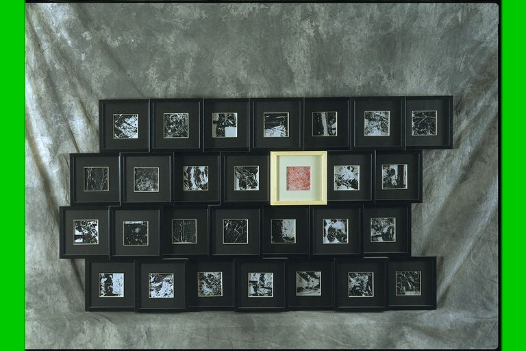 | Deskribapena: | Certamen Técnica: Fotografía-Fax Materia-soporte: Papel-Metacrilato Montaje de 28 pequeños cuadros, todos negros menos uno blanco. |
