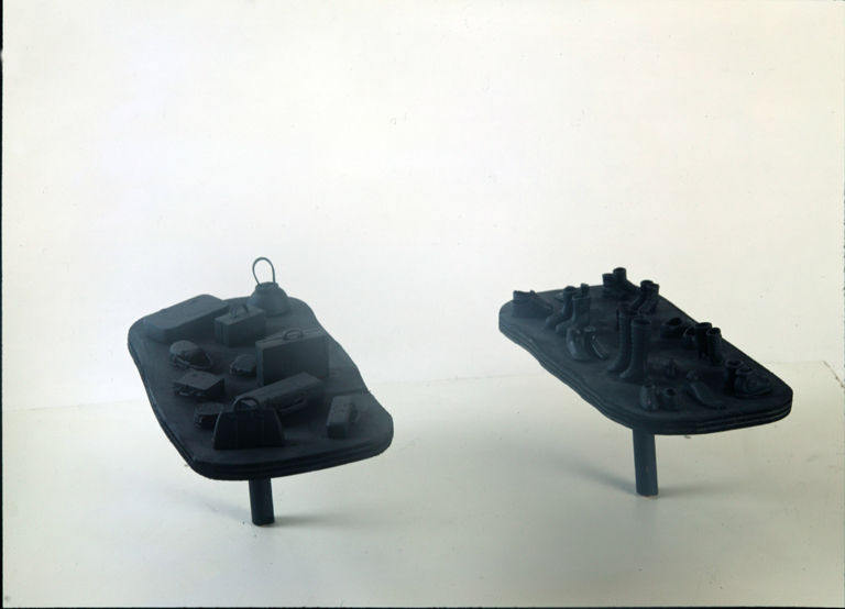 | Resumen: | Certamen Técnica: Montaje Materia-soporte: Madera-Plástico Fecha de ejecución: 2003 Dos mesas sustentadas por una pata central y una soporta maletas y bolsas de viaje y la otra zapatos, botas y toda clase de calzados. Los objetos están realizados a tamaño natural con acabado realista. |