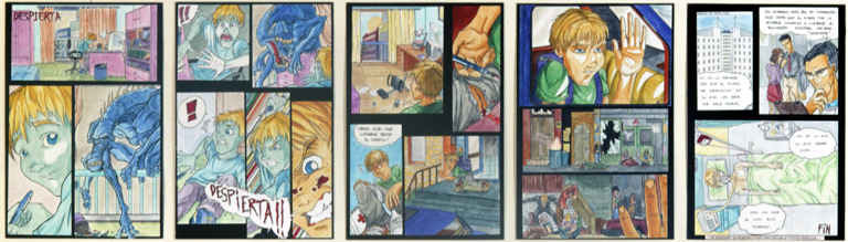 | Resumen: | XVIII Certamen Escolar de Cómic. 3º premio especial Técnica: Dibujo color Materia-soporte: Papel Fecha de ejecución: 2001 Historia de pesadilla de un muchacho dibujante que se enfrenta a la realidad de su propio monstruo. Cómic desarrollado en grandes viñetas compuestas en general con un solo personaje que impacta por su ejecución en primeros planos y planos detalle, con figuras cuyos rostros y escorzos proporcionan grandes efectos dramáticos. |