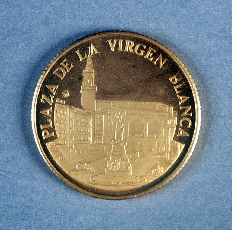 | Deskribapena: | Técnica: Acuñación Materia-soporte: Oro 900 milésimas, 21,6 Kt. Fecha de ejecución: 1979 Acuñada en 1979 con motivo del XXV aniversario de la coronación de la Virgen Blanca. Edición especial exclusiva de la Caja Municipal con la plaza en el anverso y el escudo de la ciudad en el reverso. Realizada por Acuñaciones Nacionales S.A. Acuñada en 1979 con motivo del XXV aniversario de la coronación de la Virgen Blanca. Edición especial exclusiva de la Caja Municipal con la plaza en el anverso y el escudo de la ciudad en el reverso. Realizada por Acuñaciones Nacionales S.A. Inscripción: 0033 |