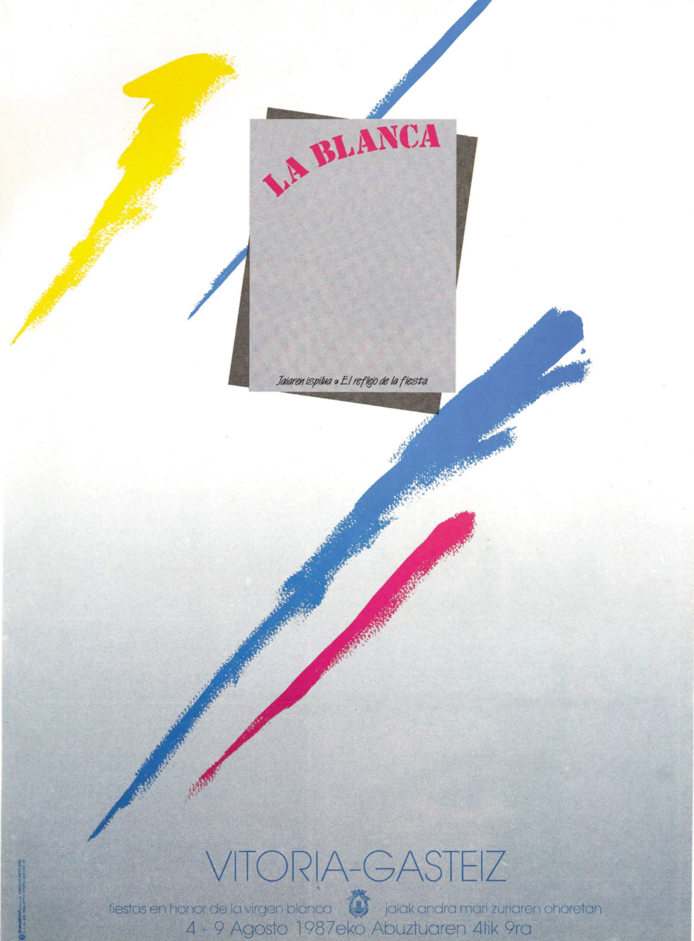 Título: La Blanca [Material gráfico] : jaiaren ispilua o El reflejo de la fiesta : Vitoria-Gasteiz : fiestas en honor de la Virgen Blanca : 4-9 agosto 1987 = Jaiak Andra Mari Zuriaren ohoretan : 1987ko abuztuaren 4tik 9ra / diseño Evagraf S. Coop.