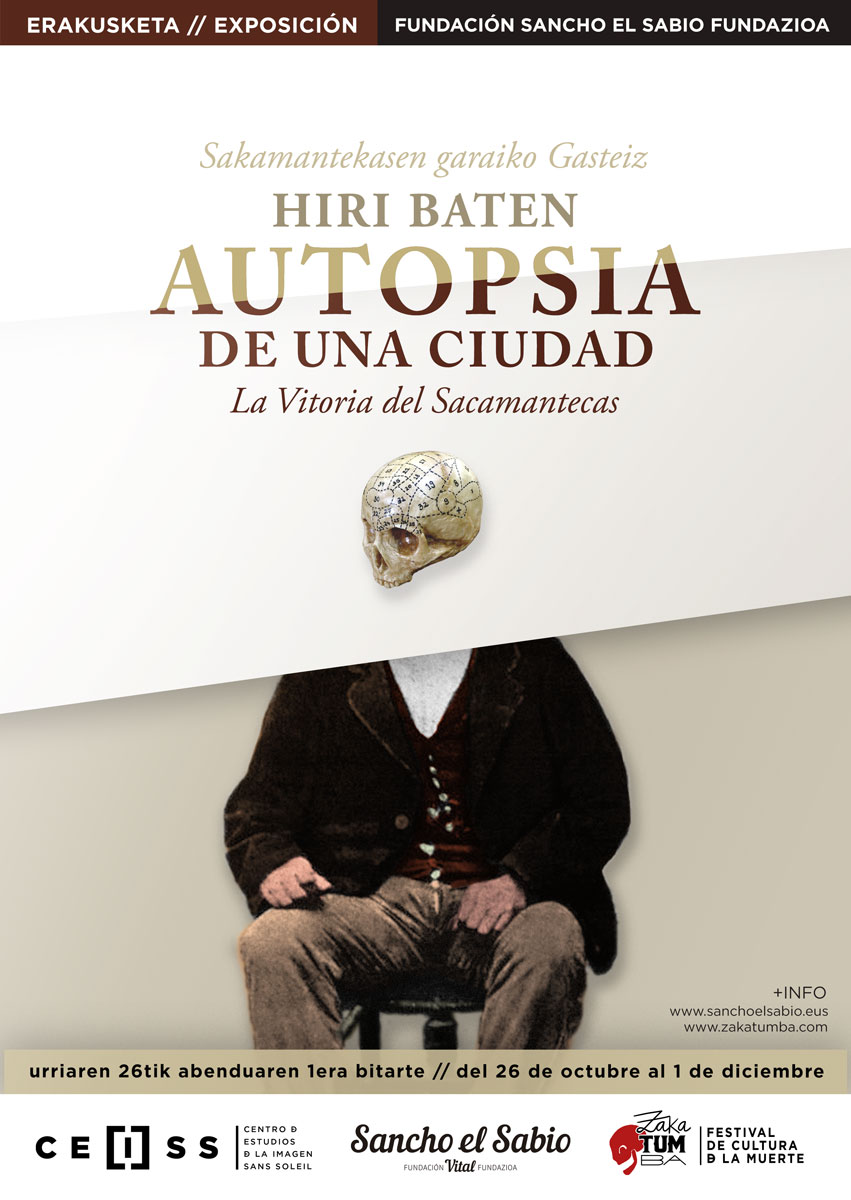 Izenburua: Hiri baten autopsia [Material gráfico] : Sakamantekasen garaiko Gasteiz : erakusketa urriaren 26tik abenduaren 1era bitarte = Autopsia de una ciudad : la Vitoria del Sacamantecas : exposición del 26 de octubre al 1 de diciembre : Fundación Sancho el Sabio Fundazioa / [diseño de Mikel Escalera].