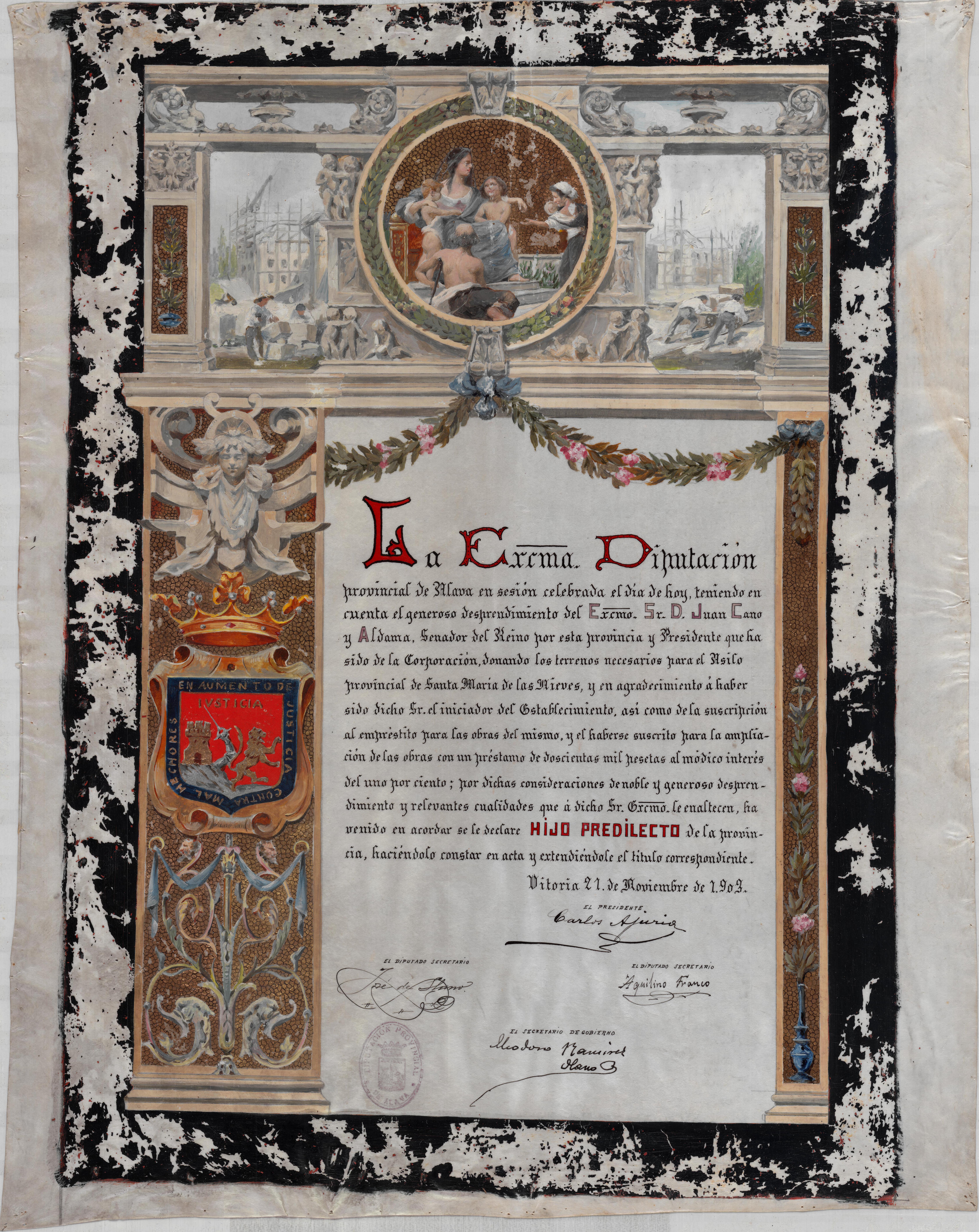 | Deskribapena: | Firmas rubricadas de Carlos Ajuria, José de Llano, Aquilino Franco y Eliodoro Ramírez Olano con sello ovalado de tinta morada "Diputación Provincial de Álava" Texto del diploma enmarcado en una orla en cuya parte superior central se representa a los nobles patricios de Roma a los que se apareció la Virgen de las Nieves y en la parte izquierda, el escudo de la provincia de Álava Coloreado a mano Restaurado Fechado en Vitoria, 21 de noviembre de 1903 |