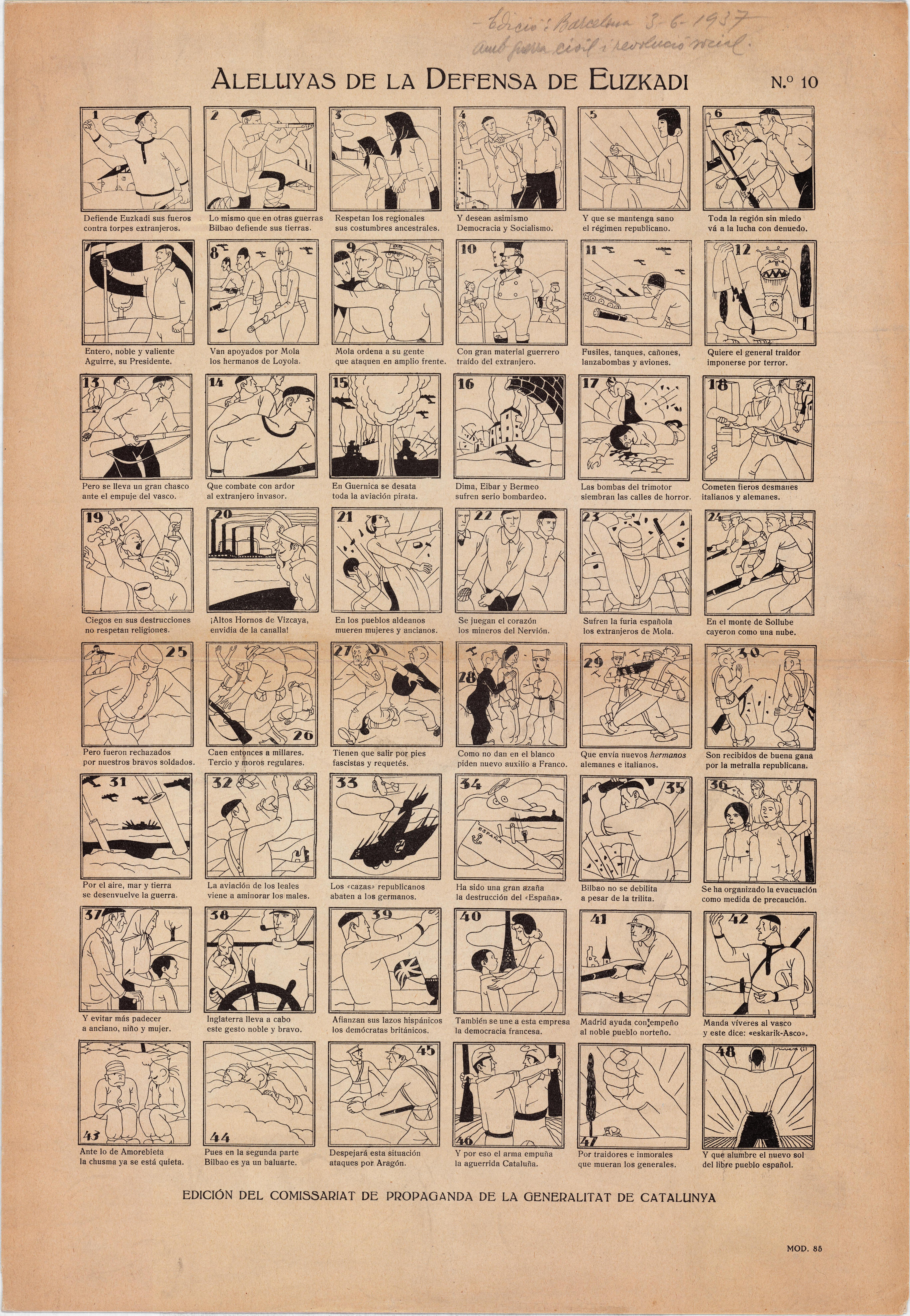 | Resumen: | Pliego de papel que presenta, bajo el título "Aleluyas de la Defensa de Euzkadi", 48 viñetas numeradas, con textos (versos pareados) en composición tipográfica al pie, relativos al desarrollo de la Guerra Civil en el País Vasco. Aleluya editada por la Generalitat de Catalunya formando parte de una serie, de la que hace el número 10, y comercializada al precio de 10 pesetas. Por los textos de las viñetas, su ejecución es anterior a la toma de Bilbao por las tropas franquistas, hecho que tuvo lugar en junio de 1937. Escrito a lápiz Barcelona 3-6-1937. |