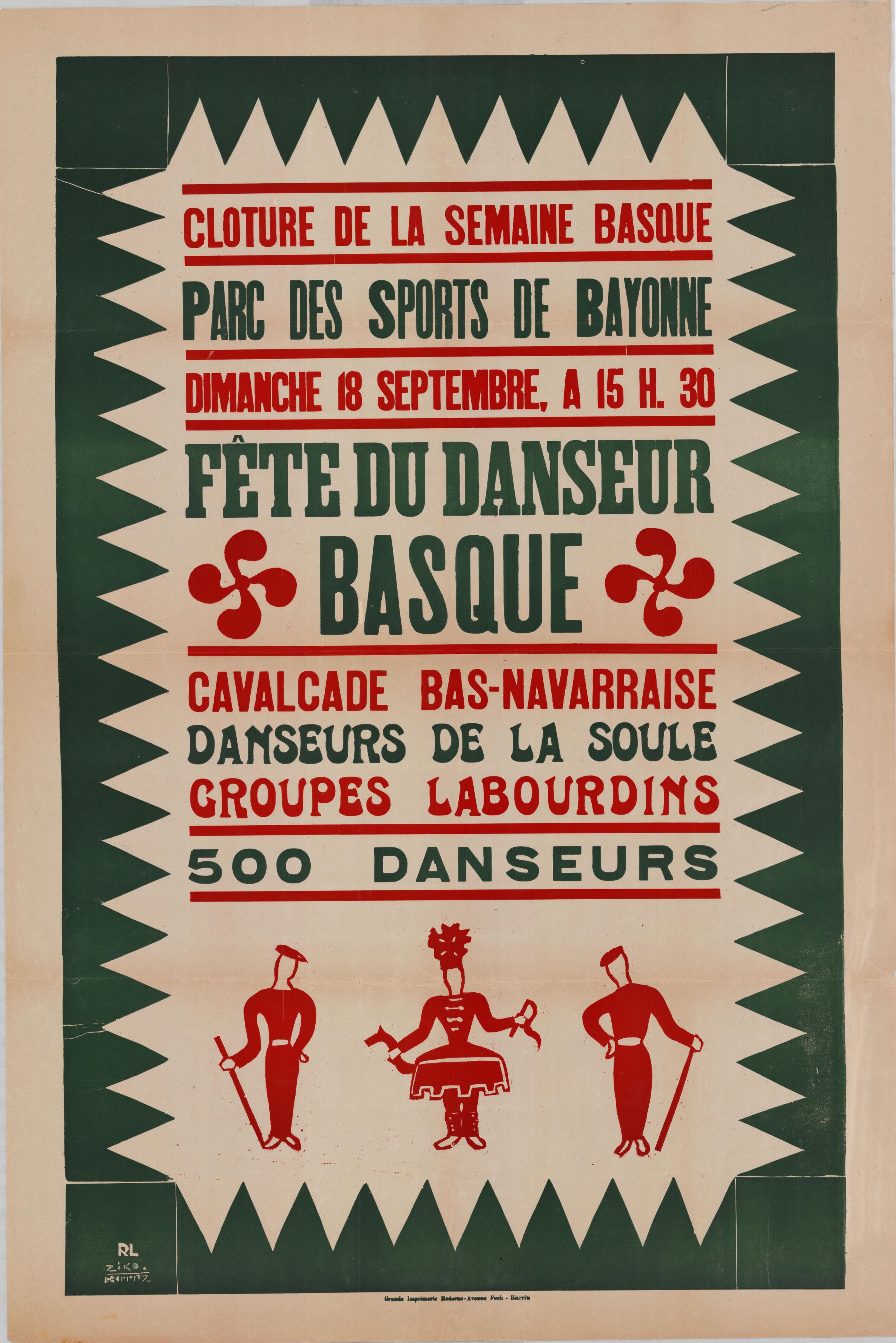 Izenburua: Fête du danseur basque [Material gráfico] : cloture de la Semaine Basque : Parc des Sports de Bayonne : dimanche 18 septembre, a 15 h. 30 : cavalcade Bas-Navarraise, danseurs de La Soule, groupes labourdins : 500 danseurs