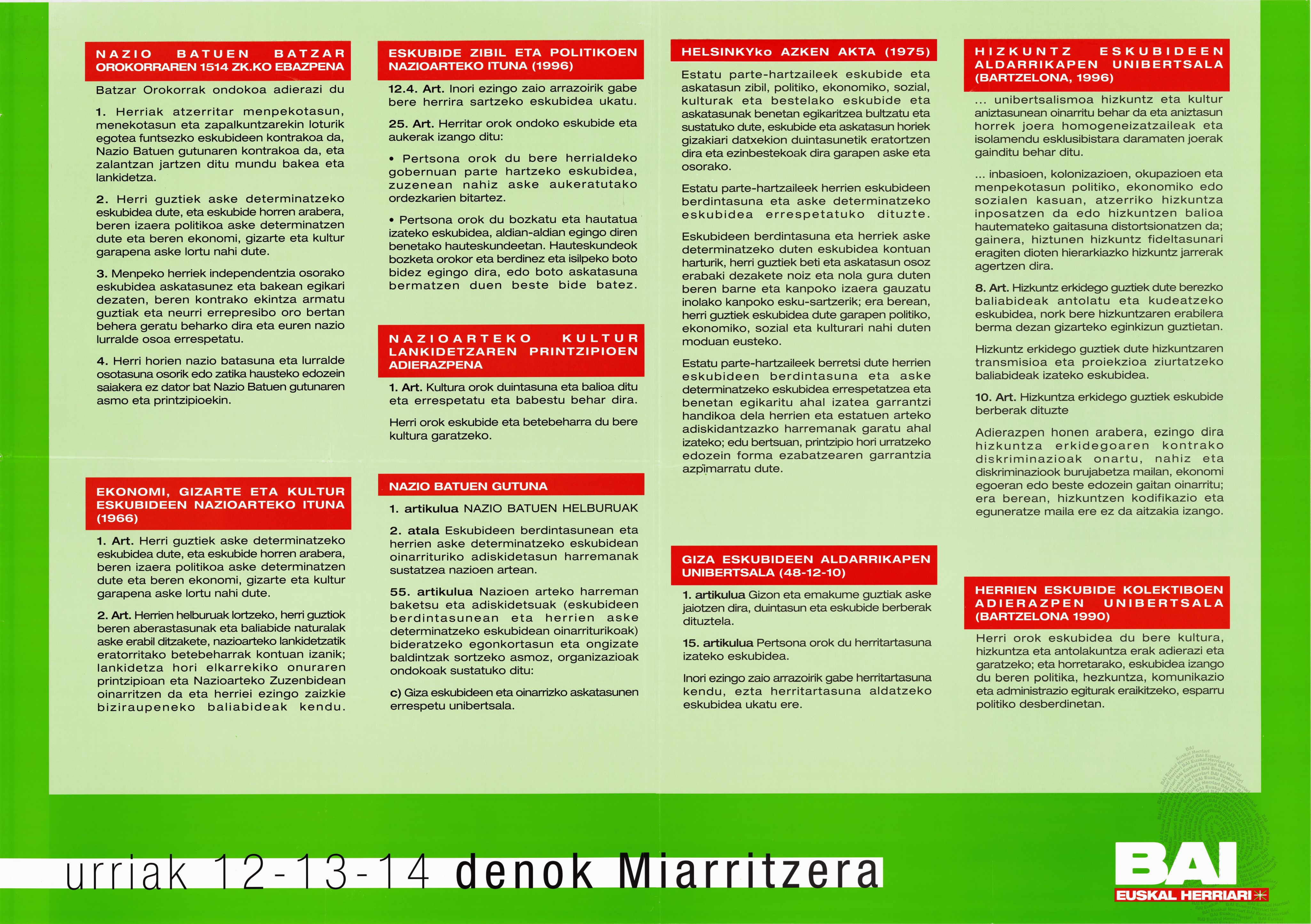 Título: Euskal Herriari urratutako eskubideak [Material gráfico] : Bai Euskal Herriari, euskal herritarron eskubide eta politikoen aldeko herri ekimena... : herri bat gara nazio bat gara! : Nazio Batuen Batzar Orokorraren 1514 zk.ko ebazpena... : urriak 12-13-14 denok Miarritzera : Bai Euskal Herriari