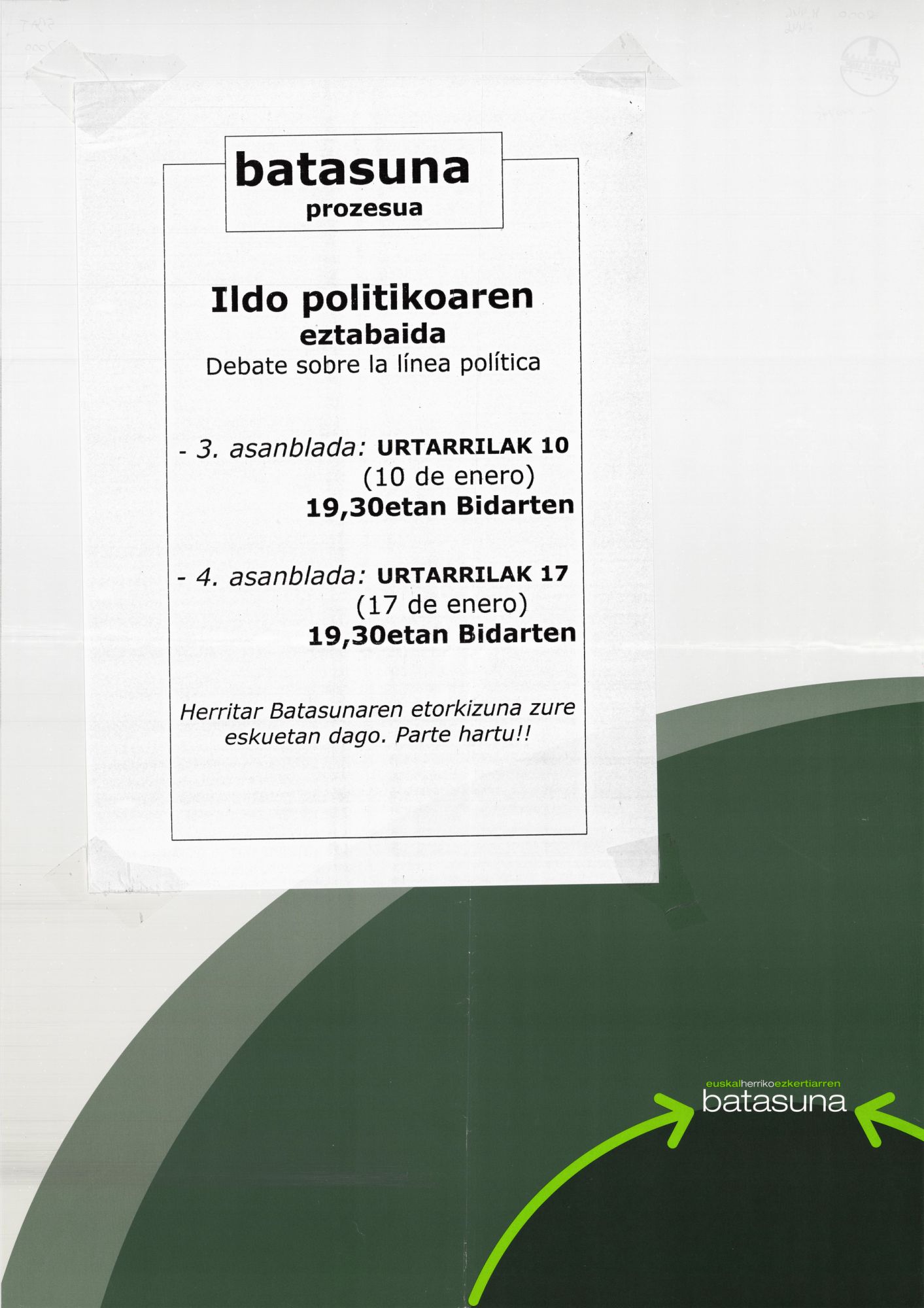 | Título: | Batasuna prozesua [Material gráfico] : ildo politikoaren eztabaida : 3. asamblada, urtarrilak 10, 19,30etan Bidarten : 4. asamblada, urtarrilak 17, 19,30etan Bidarten = debate sobre la línea política (10 de enero), (17 de enero) : herritar Batasunaren etorkizuna zure eskuetan dago, parte hartu!! |