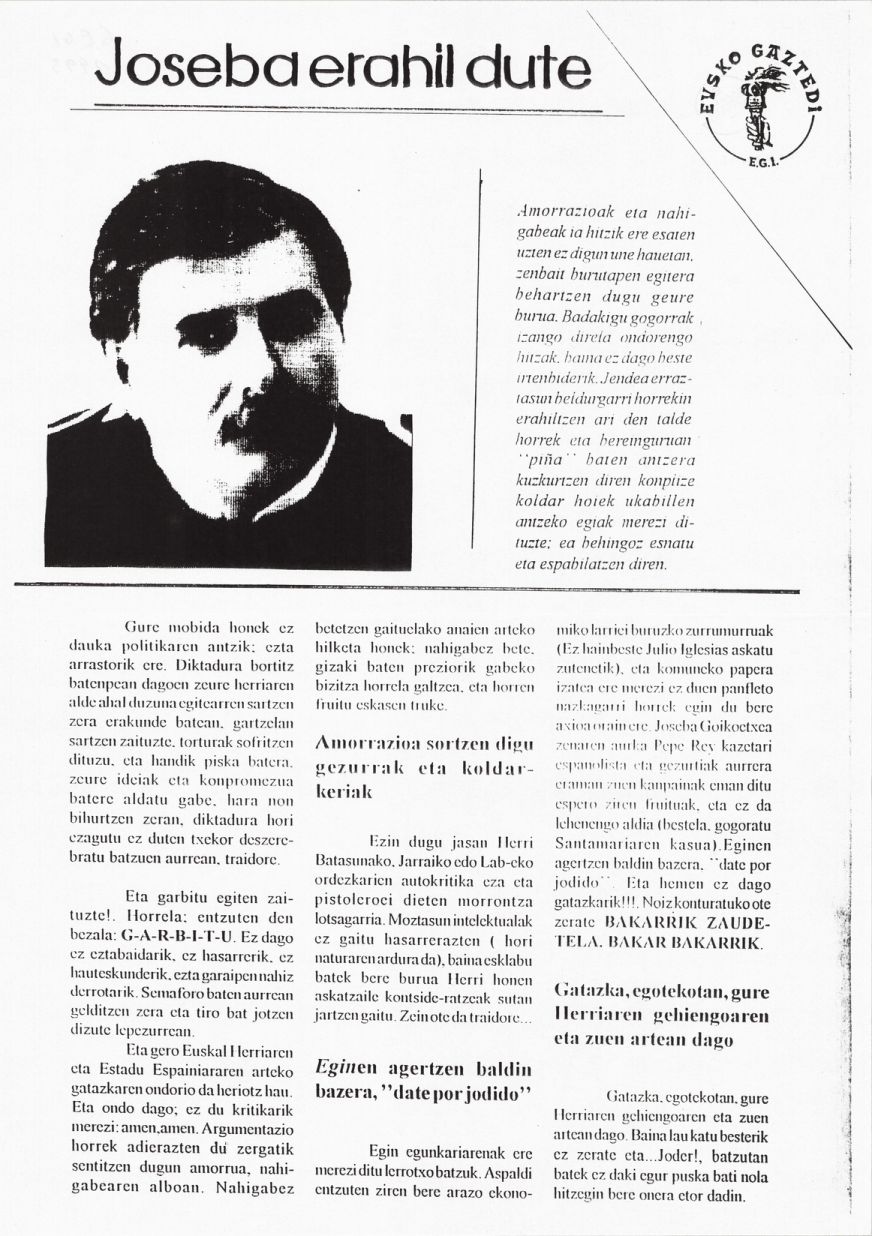 Título: Joseba erahil dute [Material gráfico] : amorrazioak eta nahigabeak ia hitizk ere esaten uzten ez digun une hauetan,... : Eusko Gaztedi, EGI