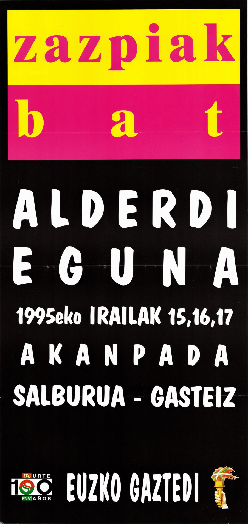 Título: Zazpiak bat [Material gráfico] : Aderdi Eguna 1995eko irailak 15,16,17 akanpada Salburua-Gasteiz : EAJ 100 urte = PNV 100 años : Euzko Gaztedi