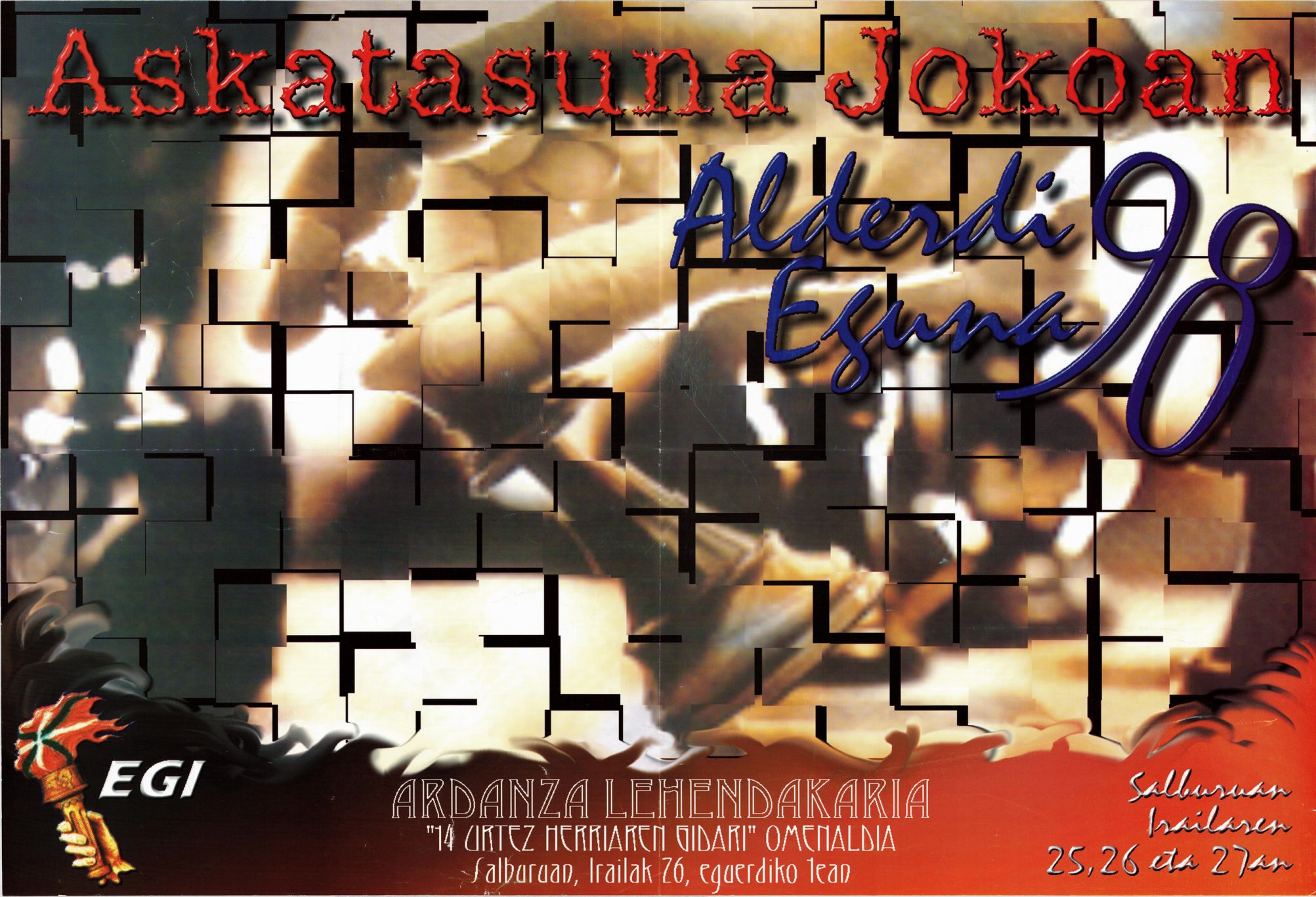 Título: Alderdi Eguna 98 [Material gráfico] : askatasuna jokoan : Ardanza lehendkaria "14 urte herriaren giari" omenaldia, Salburuan, irailak 26, eguerdiko 1ea : EGI : Salburuan irailaren 25, 26 eta 27an