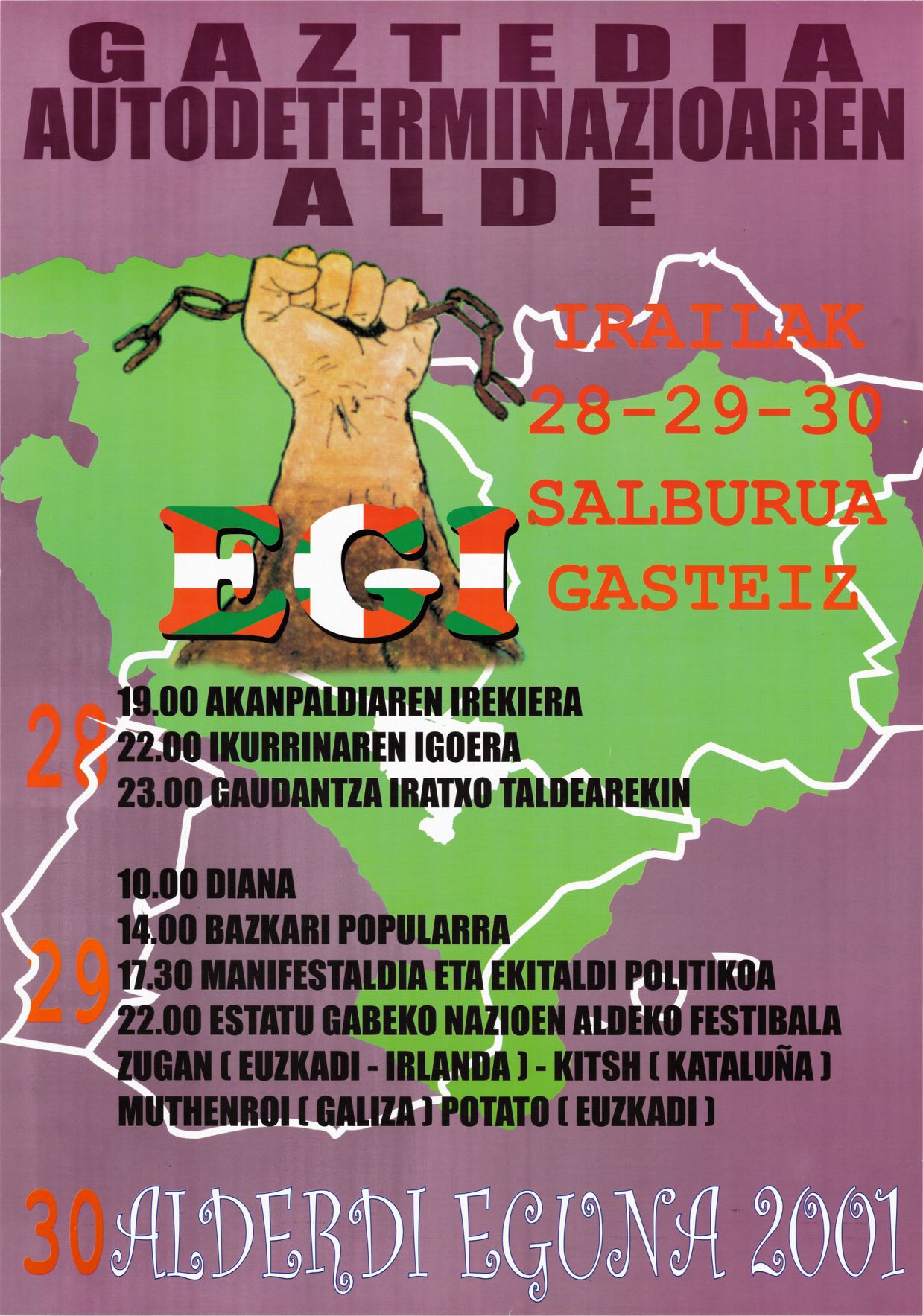 Título: Gaztedia autodeterminazioaren alde [Material gráfico] : Alderdi Eguna 2001 : irailak 28-29-30 Salburua, Gasteiz : 19:00 akanpaldiaren irekiera... EGI