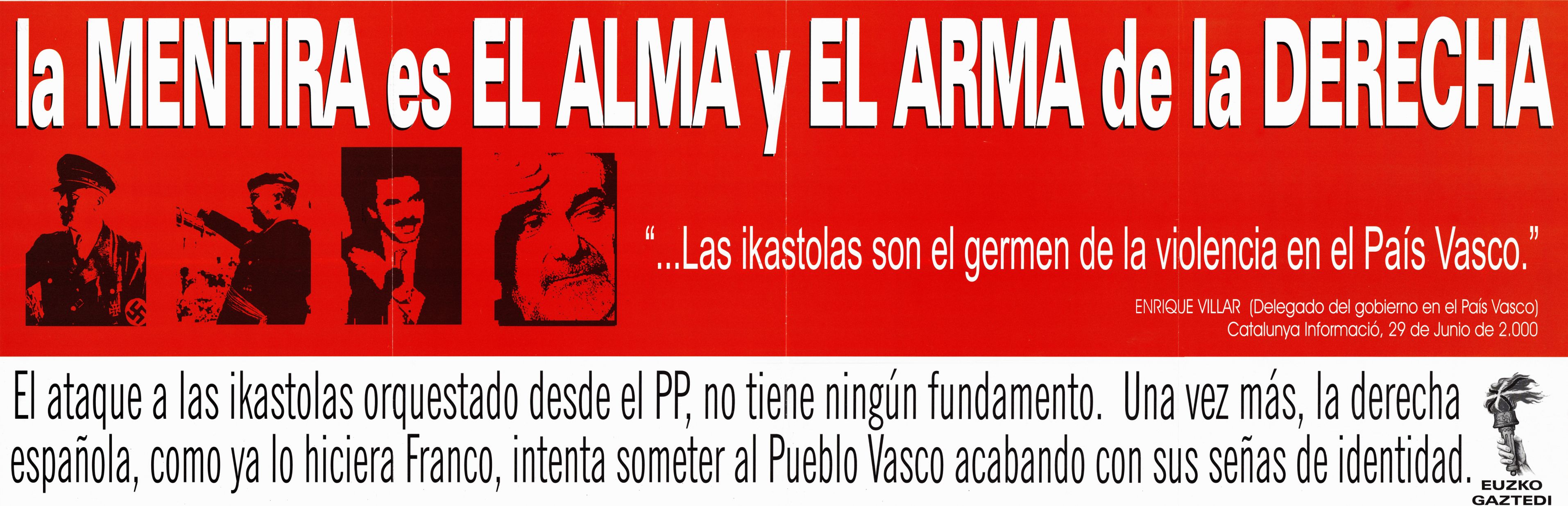 | Título: | La Mentira es el alma y el arma de la derecha [Material gráfico] : "__ las ikastolas son el germen de la violencia en el País Vasco", Enrique Villar (Delegado del Gobierno en el País Vasco), Catalunya informació, 29 de junio de 2.000 : el ataque a las ikastolas orquestado desde el PP, no tiene ningún fundamento... : Euzko Gaztedi |