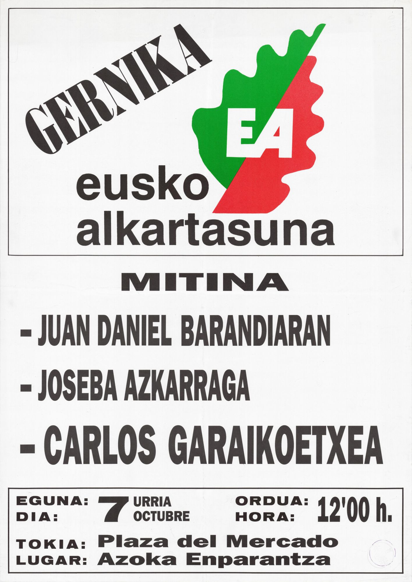 | Izenburua: | Gernika Eusko Alkartasuna EA [Material gráfico] : mitina Juan Daniel Barandiaran, Joseba Azkarraga, Carlos Garaikoetxea : eguna, 7 urria, ordua, 12'00h., tokia, Azoka Enparantza = día, 7 octubre, hora, 12'00h., lugar, Plaza del Mercado |