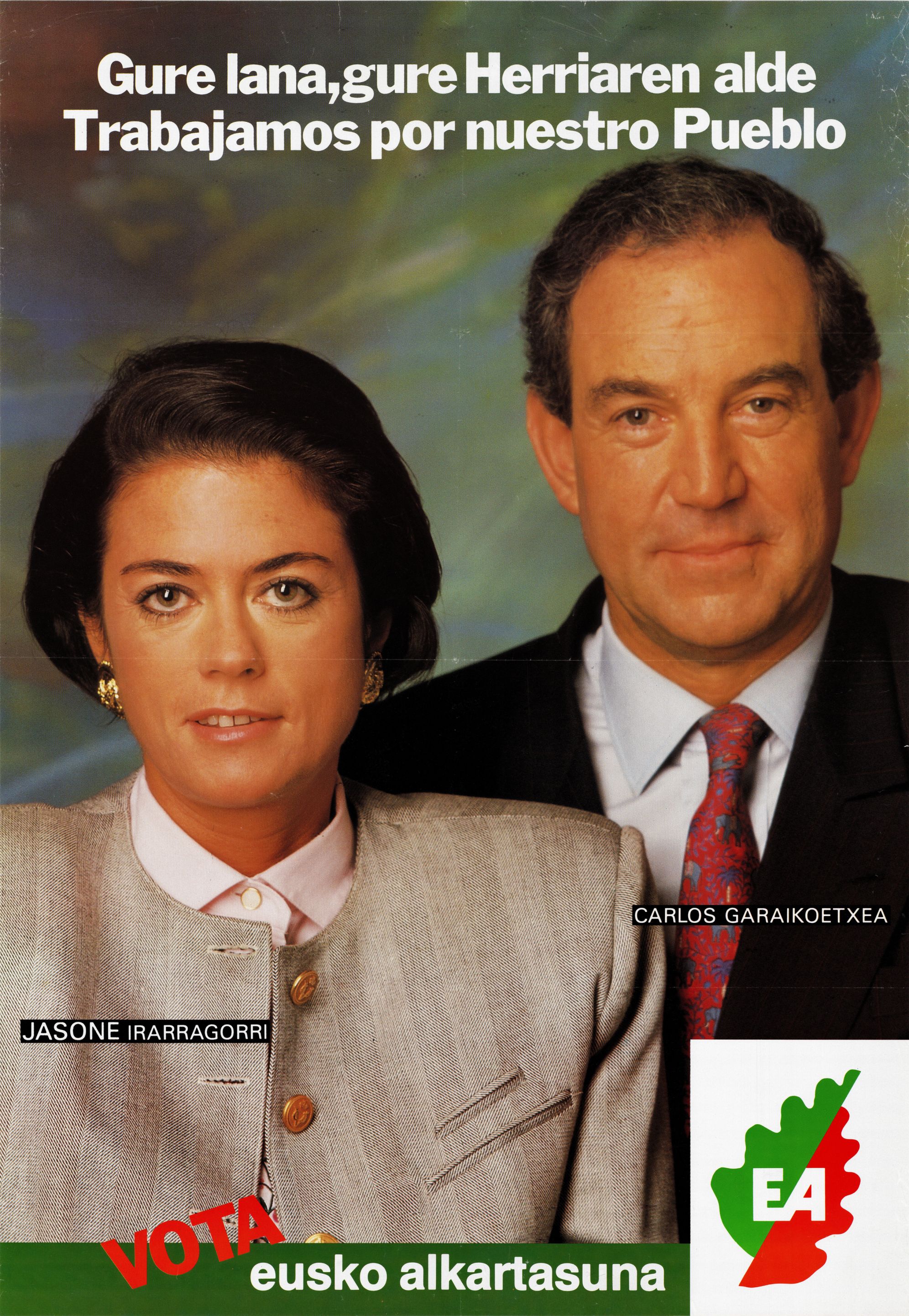 Título: Gure lana, gure herriaren alde [Material gráfico] = Trabajamos por nuestro pueblo : vota Eusko Alkartasuna EA : Jasone Irarragorri, Carlos Garaikoetxea