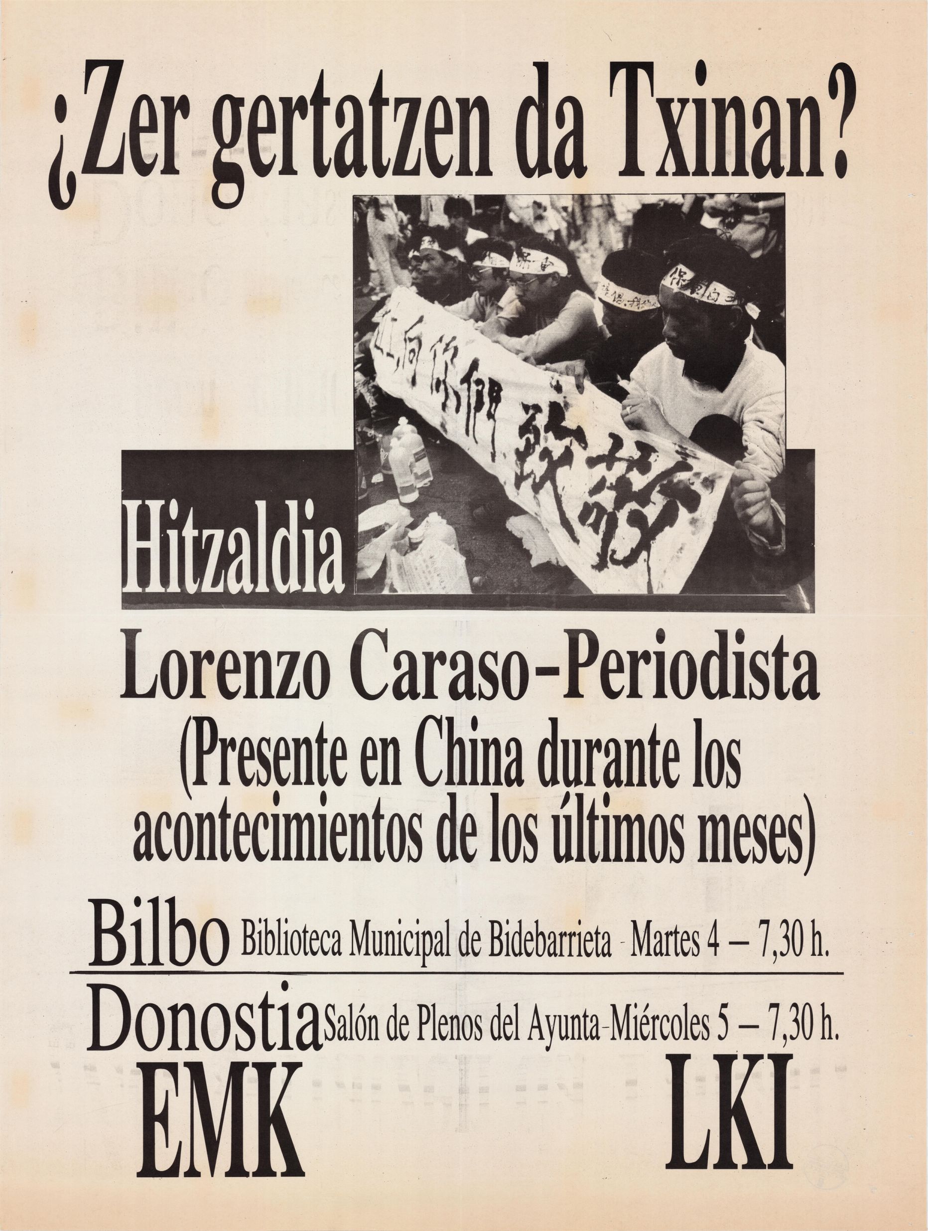 Título: Zer gertatzen da Txinan? [Material gráfico] : hitzaldia, Lorenzo Caraso - periodista (presente en China durante los acontecimientos de los últimos meses) : Bilbo, biblioteca municipal de Bidebarrieta, martes 4-7,30 h. : Donostia, salón de plenos del Ayunta -miércoles 5-7,30 h. : EMK, LKI