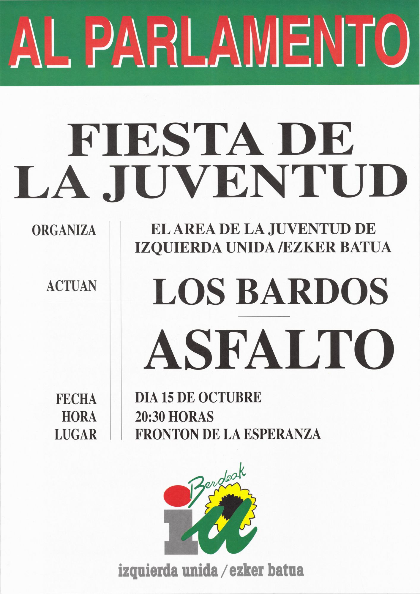 Título: Al parlamento [Material gráfico] : fiesta de la juventud : organiza el Área de Juventud de Izquierda Unida-Ezker Batua : actúan Los Bardos, Asfalto : fecha, día 15 de octubre, hora 20:30, lugar Frontón de la Esperanza : IU Izquierda Unida-Ezker Batua, Berdeak