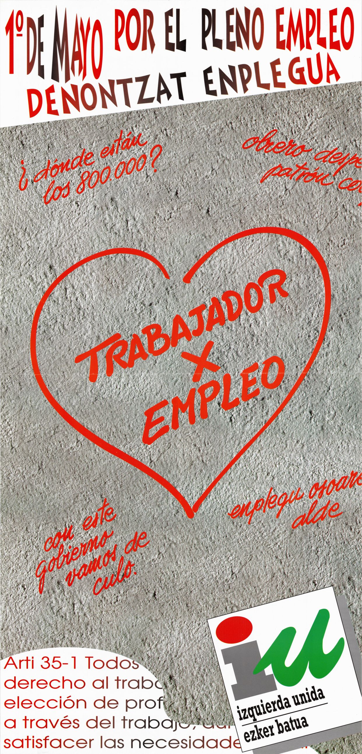 Título: Trabajador x empleo [Material gráfico] : 1o. de mayo por el pleno empleo = denontzat enplegua : dónde están los 800.000?... IU Izquierda Unida Ezker Batua