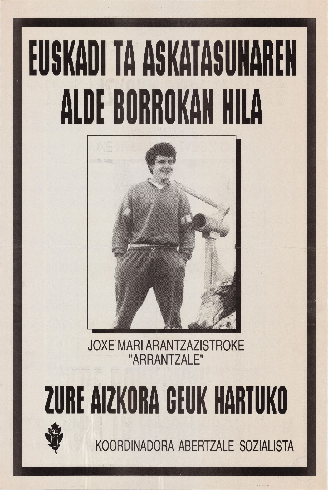 Título: Euskadi ta Askatasunaren alde borrokan hila [Material gráfico] : Joxe Mari Arantzazistroke "Arrantzale" zure aizkora geuk hartuko : Koordanadora Abertzale Sozialista