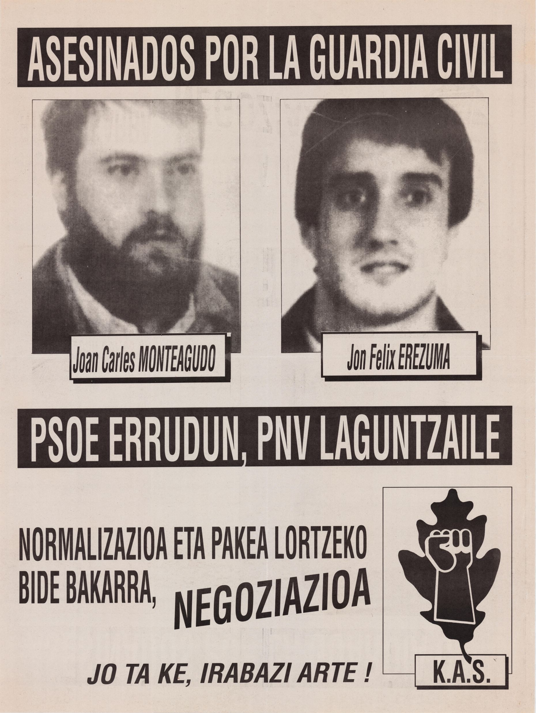 Title: Asesinados por la Guardia Civil [Material gráfico] : Joan Carles Monteagudo, Jon Felix Erezuma : PSOE errudun, PNV laguntzaile : normalizazioa eta pakea lortzeko bide bakarra, negoziazioa : jo ta ke, irabazi arte! : K.A.S
