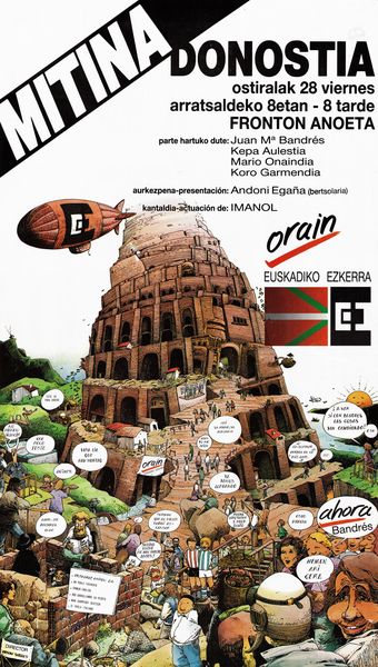 Título: Mitina [Material gráfico] : Donostia ostiralak 28 arratsaldeko 8etan - viernes 8 tarde Frontón Anoeta : parte hartuko dute, Juan Ma. Bandrés, Kepa Aulestia, Mario Onaindia, Koro Garmendia : aurkezpena-presentación, Andoni Egaña (bertsolaria) : kantaldia-actuación de, Imanol : orain Euskadiko Ezkerra