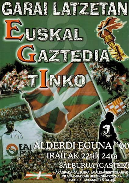 | Título: | Garai lantzetan euskal gaztedia tinko [Material gráfico] : Alderdi Eguna'00 irailak 22tik 24ra Salburua (Gasteiz), akanpada, Galeuzka jaialdia, bertsolariak, jolasak, bazkari herrikoia, txoznak, erakusketak, manifestaldia |