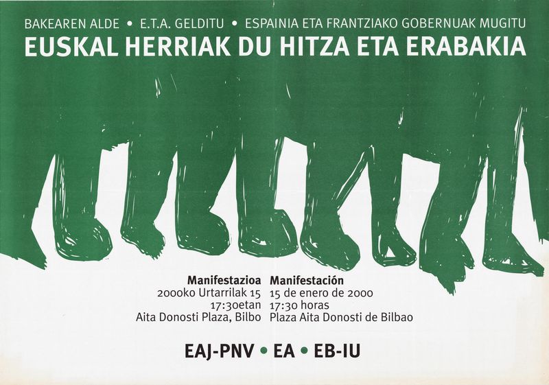 Título: Euskal Herriak du hitza eta erabakia [Material gráfico] : bakearen alde, E.T.A. gelditu, Espainia eta Frantziako gobernuak mugitu : manifestazioa 2000ko urtarrilak 15, 17:30etan, Aita Donosti Plaza, Bilbo = manifestación 15 de enero de 2000, 17:30 horas, Plaza Aita Donosti de Bilbao : EAJ-PNV, EA, EB-IU