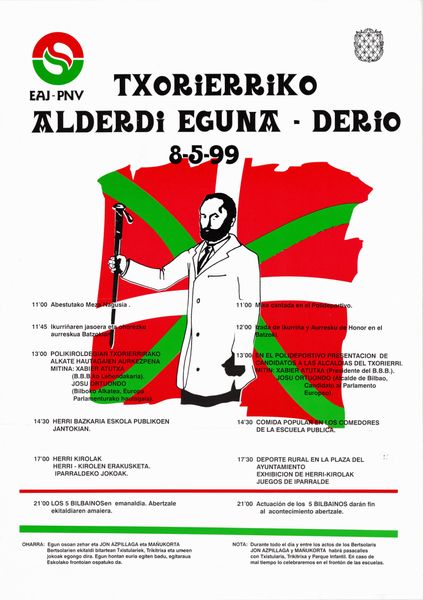 Título: Txorierriko Alderdi Eguna [Material gráfico] : Derio 8-5-99, 11:00 abestutako meza nagusia, 11'45 ikurriñaren jasoera eta ohorezko aurreskua batzokian,... = 11'00 misa cantada en el polideportivo, 12'00 izada de ikurriña y aurresku de honor en el batzoki,... : EAJ-PNV