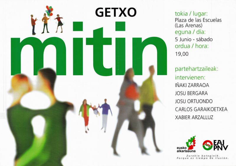 | Título: | Mitin [Material gráfico] : Getxo : tokia-lugar, Plaza de las Escuelas (Las Arenas), eguna-día, 5 junio-sábado, ordua-hora, 19,00, partehartzaileak-intervienen, Iñaki Zarraoa,... : EA Eusko Alkartasuna, EAJ-PNV : zurekin bateginik = porque es tiempo de ilusión |